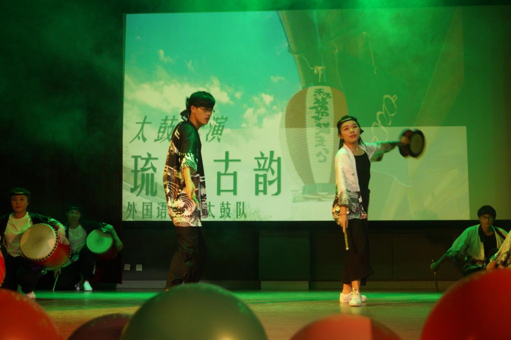 中场环节过后,精彩的节目继续上演。林孟夏老师以《32式太极剑》告别其在外院34年的教学工作;太鼓队的节目《琉风古韵》可谓是阵势十足,帅气却不乏大方,柔和而不失有力;外语联唱则又为观众们献上了一场视听盛宴。最后,压轴的走秀节目《青春派》引爆全场,精美的服装,曼妙的身姿,精心编排的步伐,无一不为这场晚会添上点睛之笔。