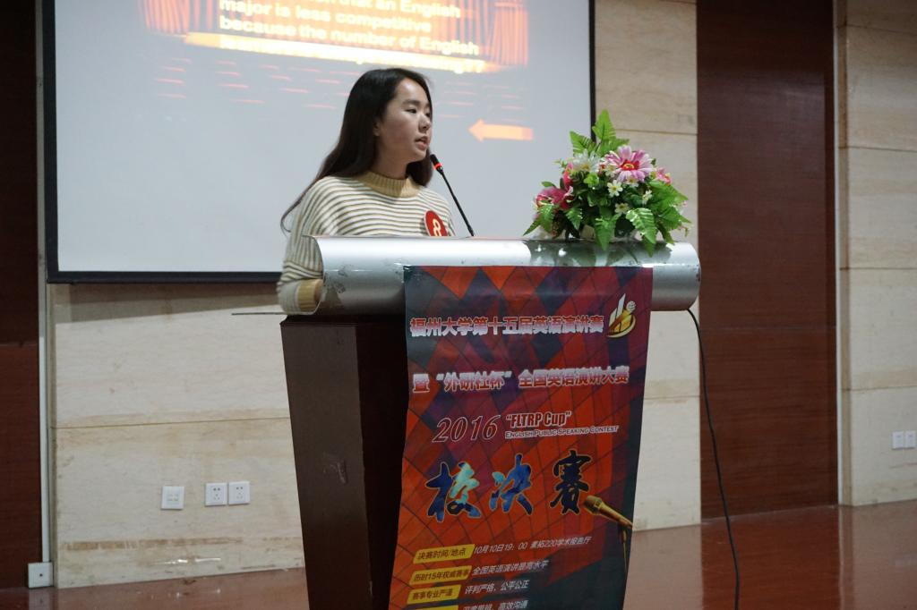 10月10日晚,由金沙集团1862cc成色教务处、金沙集团1862cc成色学生工作部(处)、金沙集团1862cc成色共青团委主办,金沙集团1862cc成色学术部承办的金沙集团1862cc成色第十五届英语演讲比赛暨2016年“外研社杯”全国英语演讲大赛金沙集团1862cc成色选拔赛校决赛在素拓学术报告厅如期举行。经院赛和校初赛的层层遴选,来自金沙集团1862cc成色各学院的15名选手晋级决赛。本次比赛邀请到金沙集团1862cc成色戴力芬老师、苏翊翔老师、林菲老师、刘燕老师和外籍教师Asher担任评委,并由曾在2014年“外研社杯”全国英语演讲赛福建省复赛中取得佳绩的金沙集团1862cc成色2012级学生黄智婷担任主持。