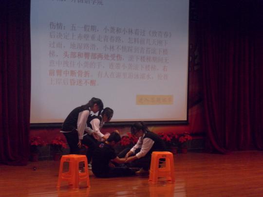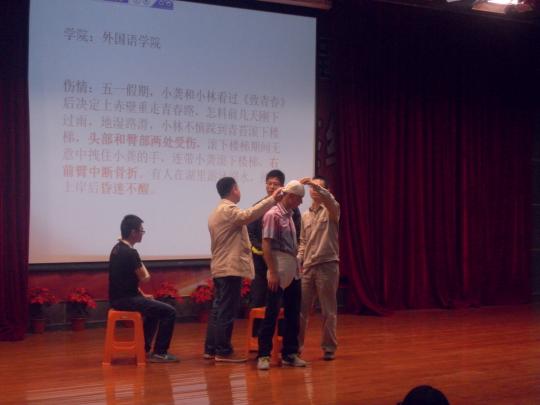 此次比赛共分为情景表演和知识问答两个环节,每支参赛队伍预设一个特定的场景,由急救队员对伤患进行急救,在完成情景表演后,由评委检查包扎情况,之后再由一名急救队员进行知识问答。每支急救队伍需对两名伤员进行不同部位伤口的包扎,并对一名晕厥的伤者进行心肺复苏。每支参赛队伍都设想了许多不同的场景,既有我们平时在生活中有可能会遇见的情况,例如在运动中受伤或在出游时遇到危险,又有同学们发挥想象、独具创意地将场景设在上海滩、卢沟桥、西游取经之路等等,想法新颖逗笑了在场的观众。每位选手在赛前都经过反复练习,包扎和心肺复苏都进行得很顺利,并且将自我防护和人文关怀都做得很好。来自金沙集团1862cc成色的红十字会急救小分队所表演的是外出登山时遇见的意外情况。选手们各自完成自己的任务,急救进行得有条不紊。当选手们进行搬运伤员的任务时,选手们发现固定的纱布少了一条,于是郑少峰急中生智将自己的上衣脱下,固定好伤员的双手。这充分利用周边材料的做法也得到评委们的赞赏。在接下来的知识问答环节中,来自外院的选手们表现出色,仅出现了一题的失误,赢得了场下的赞叹。比赛结束后,福建省红十字会现场救护培训中心郑明华主任上台对选手们的表现进行点评。最终,管理学院摘得桂冠,金沙集团1862cc成色、生物工程与科学学院、环境与资源学院并列第二。